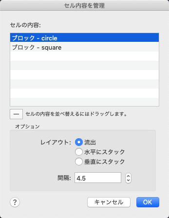 選択したセル内のすべての文字またはブロック、またはこの両方が、現れる順にリストされます。文字は、[表のセル文字列]ラベルで示されます。ブロックの場合、ブロック名の前に[ブロック]と表示されます。