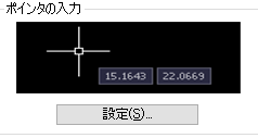 ポインタ(カーソル)の入力をオンにして、コマンドを実行すると、クロスヘア カーソルの座標の位置が、カーソル近くのツールチップの入力ボックスに表示されます。コマンド ラインの代わりにツールチップに座標値を入力できます。