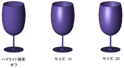 オブジェクトのハイライトのサイズは、輝度の印象に影響します。小さく、集中的にハイライトされたオブジェクトは、より輝いて見えます。表示スタイルで設定するハイライト強度は、マテリアルがアタッチされたオブジェクトには適用されません。