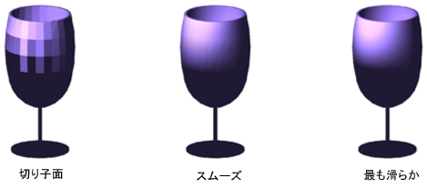 [切り子面]照明にすると、面ごとに 1 色が計算されます。個々の面は平坦に見えます。[スムーズ]照明にすると、色が面の頂点間のグラデーションとして計算されるため、ポリゴン面の間のエッジが滑らかになります。これにより、オブジェクトは滑らかに見えます。