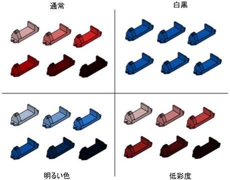 面の色を標準の方法で表示するか、面の色モードを指定できます。[単色]を選択すると、指定した色のさまざまな階調で面が表示されます。[明るい色]を選択すると、指定した色に基づいて色相と彩度の値が変更されて面がシェーディングされます。[彩度を落とす]を選択すると、色がソフトになります。