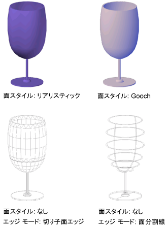 面スタイルにより、面のシェーディングを定義します。[リアリスティック]を選択すると、リアルな効果が得られます(左下図)。[Gooch]を選択すると、光に照らされた領域と影になる領域とのコントラストが和らぎ、細部が詳細に表示されます(右下図)。光に照らされた領域には暖色が使用され、影になる領域には寒色が使用されます。