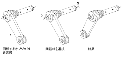 3. オブジェクトの回転の中心にする軸の始点(2)と終点(3)を指定します 。