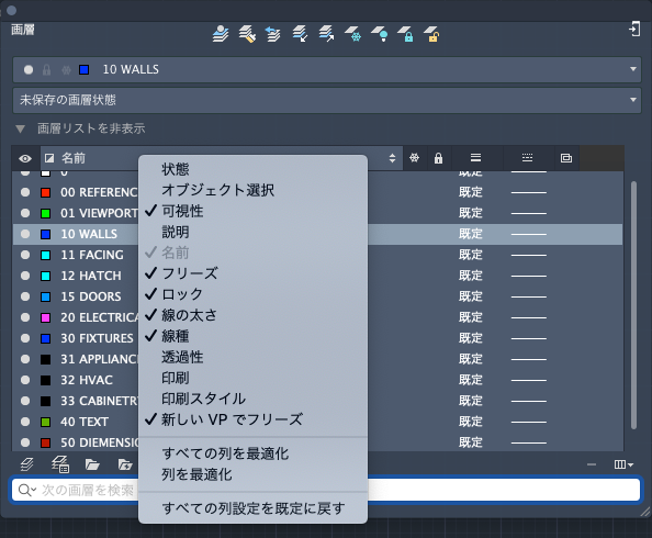 図面の画層とそのプロパティの一覧が表示されます。画層の追加、削除、名前変更を行ったり、画層のプロパティを変更したり、リアルタイムに変更を適用することができます。