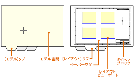 レイアウト内の領域は「ペーパー空間」と呼ばれ、図面に必要なタイトル ブロックを追加したり、「レイアウト ビューポート」ないのモデル空間のビューの表示倍率を調整したり、表、集計表、注記、寸法を記入することができます。