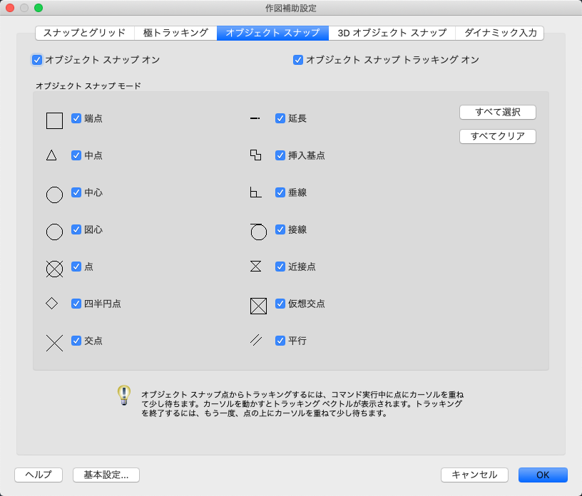 定常オブジェクト スナップとしてオンにできるオブジェクト スナップを一覧表示します。