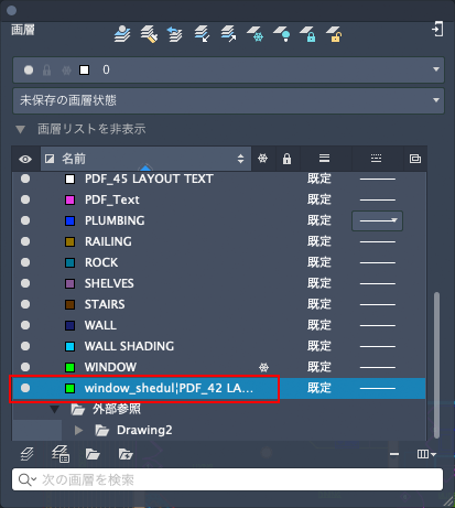 図面ファイルをアタッチすると、その図面の画層と画層のプロパティが現在の図面に追加されます。各画層名の前には外部参照の名前が追加されます。外部参照の名前は、参照図面ファイル名とは異なることがあります。
