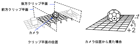 図面のビューは、オブジェクトの表示をコントロールする前方クリップ平面と後方クリップ平面を、それぞれ理論カメラからの距離に基づいて配置することによってクリップできます。クリップ平面は、カメラと目標(カメラが向いている位置)との間の視線に対して垂直な平面で、これを移動することができます。クリップすると、クリップ平面の前後のオブジェクトの表示は除去されます。次の図は、クリップ平面の動作を表したものです。