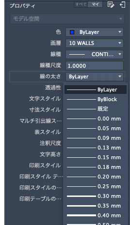 線の太さは[ByLayer]のままにすることも、画層の線の太さよりも優先される値を指定することもできます。一部のケースで線の太さのプレビューがすべて同じに見える理由は、モニタでは線の太さが近似化されたピクセル幅で表示されるためです。