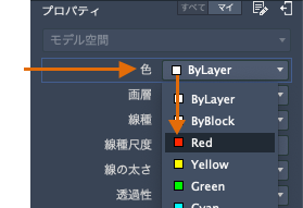 [プロパティ インスペクタ]パレットには、重要なプロパティの設定がすべてリストされます。使用可能なフィールドをクリックすれば、その現在の設定を変更できます。次の例では、オブジェクトが選択されていない場合、現在の色は[ByLayer]から[Red]に変更されます。これ以降に作成するオブジェクトには、[Red]の色プロパティが割り当てられます。