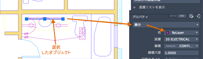 パレットには、選択したオブジェクトの現在のプロパティが表示されます。これらのプロパティは、項目をクリックし、設定を変更することで修正できます。"ByLayer" に設定されているプロパティは、画層の設定を継承しています。上記の例では、画層 20 ELECTRICAL 上に作成されたオブジェクトは紫色です。これは、この色がこの画層上のオブジェクトの既定の色であるためです。