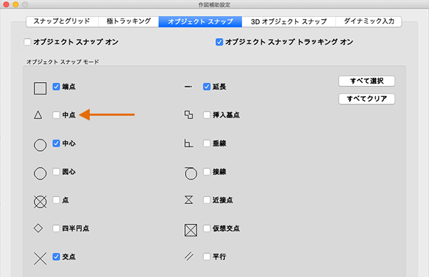 「定常オブジェクト スナップ」と呼ばれる既定のオブジェクト スナップを設定するには、OSNAP[オブジェクト スナップ設定]コマンドを使用します。たとえば、[中点]オブジェクト スナップを既定でオンにしておくと便利な場合があります。