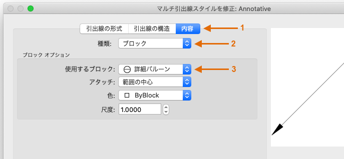 をクリックし、新しいマルチ引出線スタイルのわかりやすい名前を指定します。次に示すように、[内容] (1) をクリックし、[ブロック] (2) を選択し、[詳細バルーン] (3) を選択します。