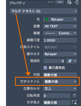 他のいくつかの注釈機能と同じように、マルチ テキストにも多数の設定が用意されています。このような設定は、STYLE[文字スタイル管理]コマンドを使用して「文字スタイル」 として保存できます。その後、[プロパティ インスペクタ]パレットの[文字スタイル]ドロップダウン矢印をクリックして保存した文字スタイルにアクセスすることができます。オブジェクトが選択されていない場合、[プロパティ インスペクタ]パレットには現在の文字スタイルが表示されます。