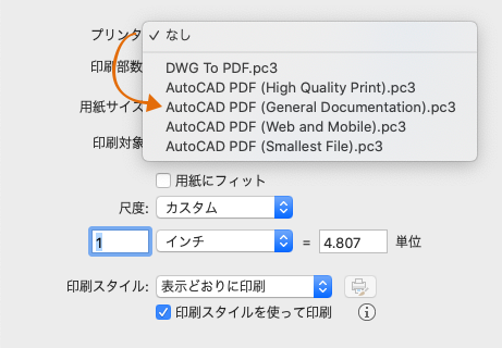 [プリンタ/プロッタ]ドロップダウン リストから、[AutoCAD PDF (General Documentation).pc3] を選択します。