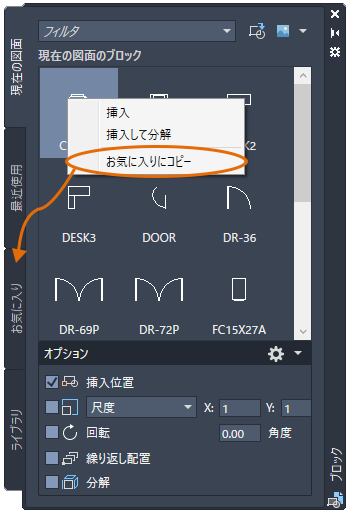拡張パレットを使用すると、AutoCAD 図面ファイル(DWG)を最初に[ライブラリ]タブに追加しなくても、ブロックとして現在の図面にすばやく挿入できます。新しい[DWG をブロックとして挿入]オプション(