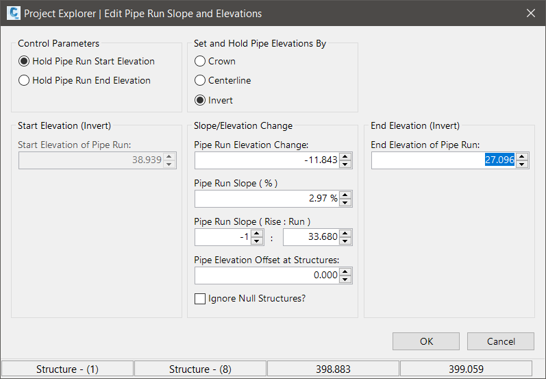 A new pipe slope value can be applied while holding the elevation of the start or end of the selected pipe run, and if there are any changes to the diameter of pipes in the current run you can elect to hold the invert, crown, or centerline elevations of pipes when crossing each structure. Pipe slope can be expressed in percent or run:rise, and an elevation offset can optionally be applied when crossing each structure in the pipe run.