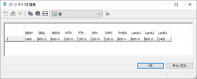 - パーツの新しいサイズを追加するには、パラメータ値をクリックし、ツールバーで[編集]をクリックします。