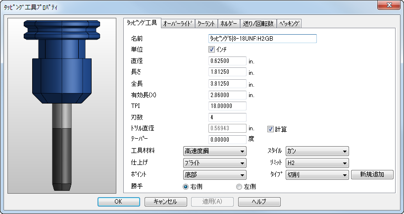単位 - 工具の寸法の単位です。インチの場合、インチ を選択します。このオプションが選択されていない場合、単位はミリメートルになります。