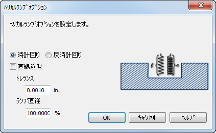 加工初期設定 ダイアログ、[フライス加工] > [リード / ランプ] ページの ヘリカル ランプ を選択して ヘリカル オプション をクリックし、ヘリカル ランプ オプション ダイアログを表示します。