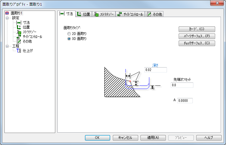 パーツ サーフェス と チェック サーフェス ボタンは、3D サーフェス加工フィーチャーの場合と同じように作用しますが、3D 面取りでこれらの使用は任意です。
