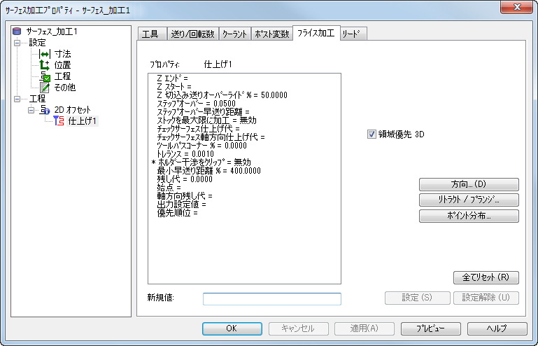 チェック サーフェス軸方向仕上げ代 - チェック サーフェス上に残しておく、軸方向(Z)の材料の量を入力します。チェック サーフェス軸方向仕上げ代 を設定した場合、チェック サーフェス仕上げ代 の値は、チェック サーフェスの径方向(XY)のみに適用されます。チェック サーフェス軸方向仕上げ代 が未設定の場合、チェック サーフェス仕上げ代 の値は、チェック サーフェスの軸方向と径方向に適用されます。正と負の、どちらの値にも指定可能です。