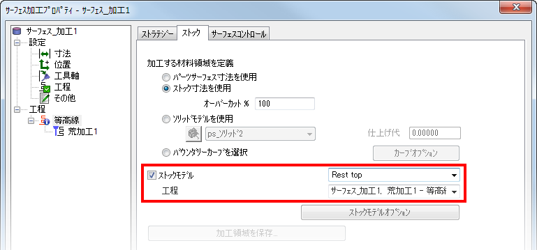 2 つめのフィーチャーの ストック タブの ストック モデル オプションをクリックして、ドロップダウン リストからストック モデルの名前と 工程 を選択します。