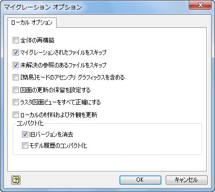 - [モデル履歴のコンパクト化]: このオプションを選択すると、フィーチャ編集の高速化に使用されるロールバック履歴が削除されるため、ファイルを新しいリリースにマイグレーションするときは選択しないでください。このオプションは、非常に大きなアセンブリを使用している場合やディスク容量が限られている場合にのみ使用してください。