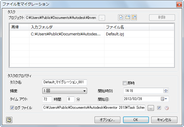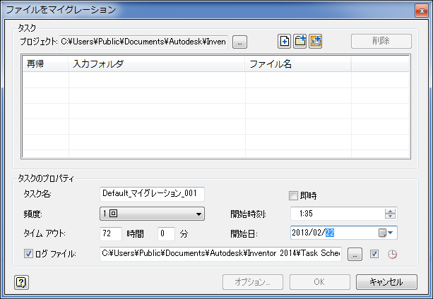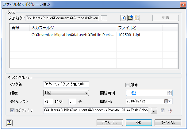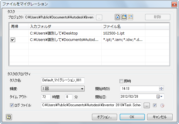 タスク スケジュールにより、ログ ファイルが生成され、正常にマイグレーションされたファイルとされなかったファイルが記録されます。このファイルは ASCII 形式(.txt)で、既定では C:¥My Documents¥Inventor<バージョン>¥Task Scheduler¥Log & Report Files または C:¥ユーザー¥パブリック¥ドキュメント¥Autodesk¥Inventor<バージョン>¥Task Scheduler Logs & Reports に生成されます。