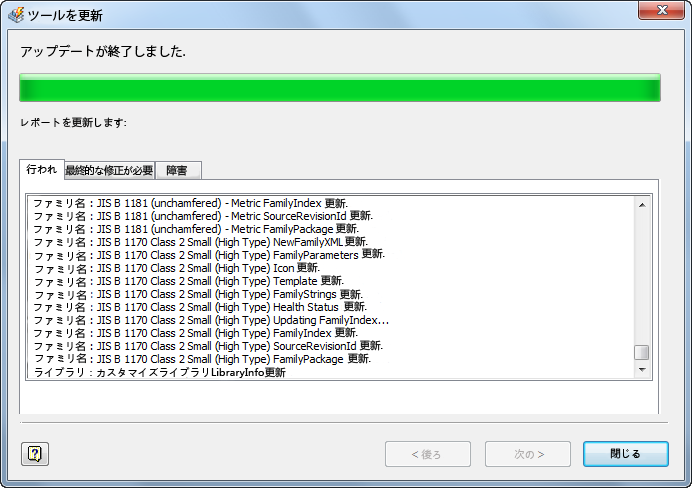 ヒント(ライブラリ間のクロス リファレンス): クロス リファレンスがある場合で、ユーザ ライブラリ(UL1)にユーザ ライブラリ UL2 内のファミリ用のソース ファミリが含まれており、UL2 にユーザ ライブラリ UL1 内のファミリ用のソース ファミリが含まれている場合、両方のライブラリをアタッチし、UL1 と UL2 に対して手順を追って更新ツールを実行します。