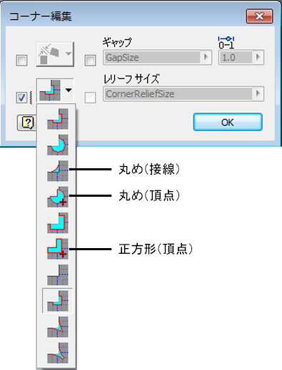 [丸め(接線)]、[丸め(頂点)]、[正方形(頂点)]の各オプションがコーナー レリーフに追加され、配置ソリューションが拡充されました。