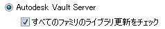 Vault サーバにカスタム ライブラリがある場合は、新しいアプリケーション オプション設定の[ライブラリのすべてのファミリの更新を確認]を選択解除して、カスタム ライブラリ内のすべてのファミリが Vault サーバ上の親ライブラリに対して同期するのを迅速に抑制します。