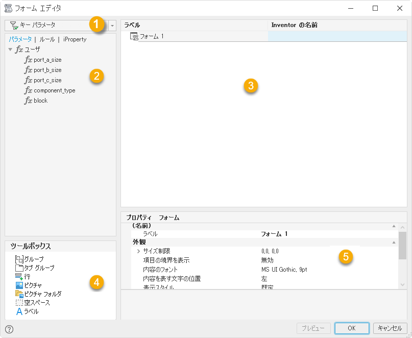 フォーム デザイン ツリーのハイライトした項目のプロパティを定義します。プロパティは、選択した項目によって異なります。