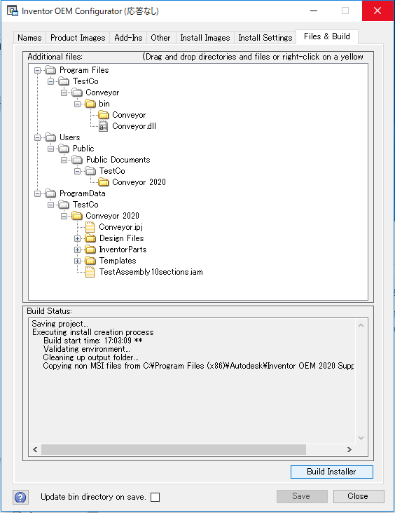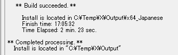 ウィンドウの下部に[Build complete]と表示されたら、C:\Temp\X\Output\x64_English の OEM インストーラはアプリケーション全体用の完全なインストーラになっています。
