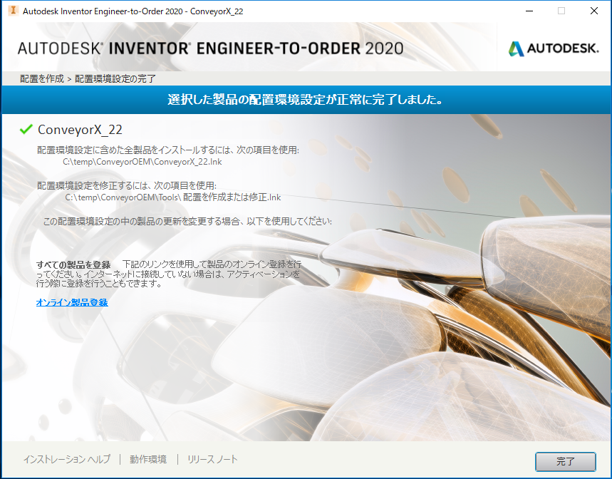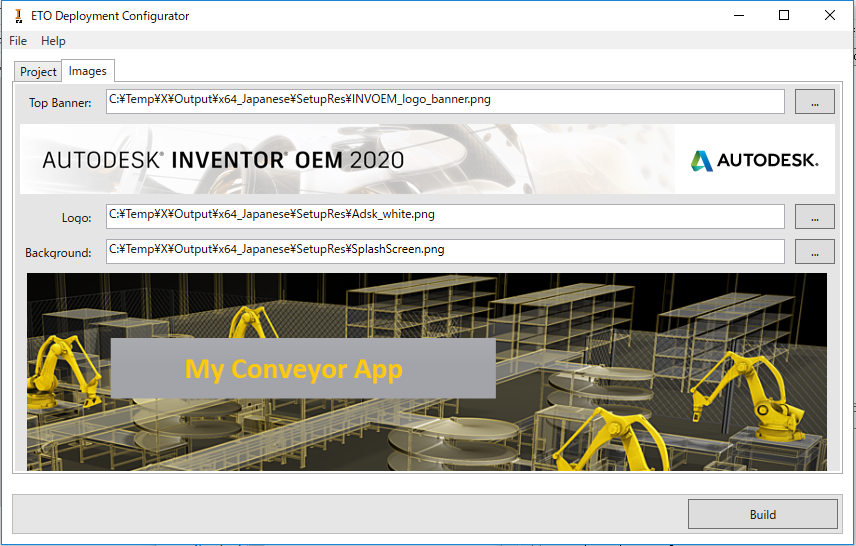 この手順では、ETO 配置コンフィギュレータを使用して Inventor OEM インストーラと ETO インストーラを結合します。これにより、OEM インストーラが作成された場所に単一のインストーラが作成されます。ETO インストーラ全体から必要なファイルがこの場所にコピーされ、OEM コンフィギュレータによって作成されたいくつかのファイルが変更されます。