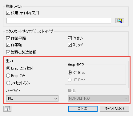 - バージョン 10.3 以降を選択した場合、JT Brep は使用できません。
