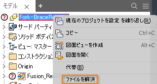 1 つ以上の AnyCAD ファイルへの参照が見つからないパーツまたはアセンブリ ファイルを開いく場合、[リンクを解決]ダイアログ ボックスが表示され、見つからない参照を検索して見つけることができます。未解決の参照をスキップするよう選択した場合、開いているファイルで一番上のブラウザ ノードの横に[未解決]アイコンが表示されます。ブラウザの最上位ノードを右クリックし、新しい右クリック メニューのオプション[ファイルを解決]を選択して、再び[リンクを解決]ダイアログ ボックスを開くことができます。