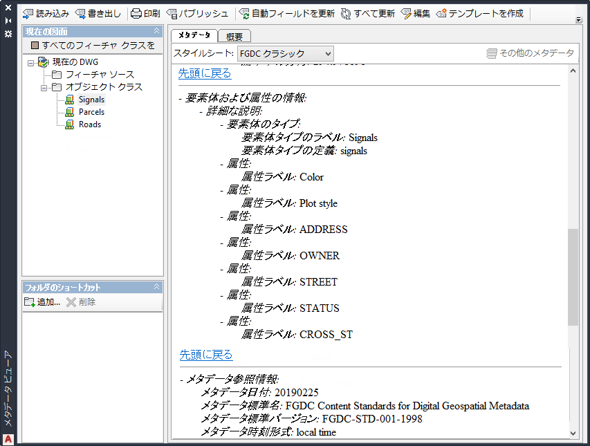 メタデータは、図面自体に格納されます。メタデータは、図面を編集するたび、または分類済みオブジェクトを含むアタッチされた図面に再接続するたびに更新されます。