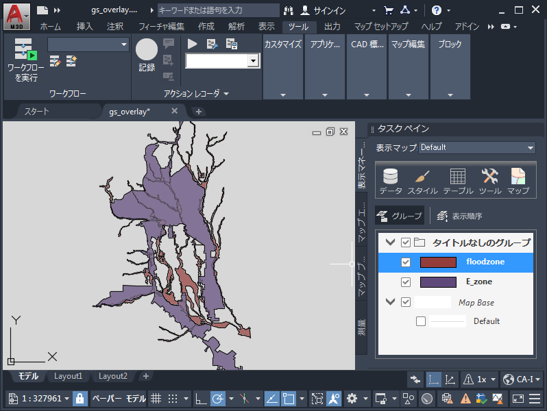 ワークフローを実行すると、AutoCAD Map 3D toolset は指定のフォルダにある SDF ファイルを一覧表示します。次に、作成された画層を保持するグループを[表示マネージャ]に作成します。指定のフォルダ内の SDF ファイルに接続し、指定のフォルダ内の各図面について、画層を[表示マネージャ]に接続および追加して、それらの画層を新しいグループに移動します。