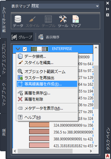 - [表示マネージャ]で、サーフェス画層を右クリックし、[等高線画層を作成]をクリックします。