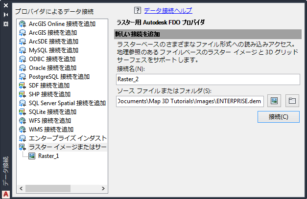 - [データ接続]ウィンドウの[プロバイダによるデータ接続]で、[ラスター イメージまたはサーフェス接続]をクリックし、[ソース ファイルまたはフォルダ]の横の