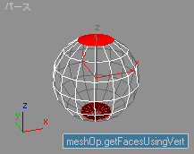obj =Sphere() --create a Sphere convertToMesh obj --collapse to EditableMesh --Get the faces used by the first vertex (north pole) verts= meshop.getFacesUsingVert obj #{1} --Add the faces used by the last vertex (south pole) verts+= meshop.getFacesUsingVert obj #{obj.numverts} --Select the faces used by both pole vertices setFaceSelectionobjverts update obj --update the mesh max modify mode --switch to modify mode select obj --select the mesh subObjectLevel = 3 --switch to face sub-object level