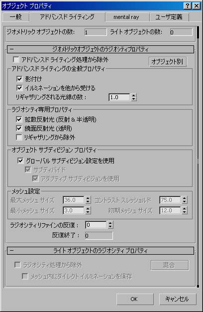 [オブジェクト プロパティ](Object Properties) > [アドバンスド ライティング] (Adv.)パネルにある[アダプティブ サブディビジョンを使用](Use Adaptive Subdivision) の値に対応します。3ds Max 8 以降 で使用可能です。