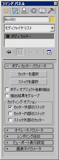Body_Cutter - superclass: GeometryClass; super-superclass:node - 11:6 - classID: #(399379502, 1556289495)3ds Max 2011 に導入された Body_Cutter オブジェクトは、ボディ オブジェクトでカット操作を実行するために使用します。