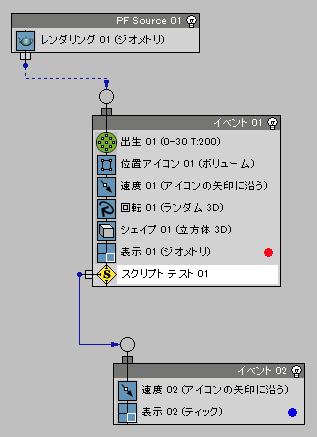 Init ハンドラにおいて Script_Test テストは、一意の Age Test アクションを作成するか、それが作成済みの場合は既存の Age Test アクションにアクセスします。次に、Age Test の Proceed メソッドを呼び出し、テスト結果を取得します。さらに、Age Test をまだ通過していないパーティクルのみを取り出し、球状ボリュームと照合します。ボリューム内部に落下しているパーティクルも、Script Test を通過します。