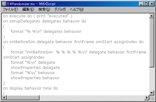 <scripted_behavior>.script: string[MAXScript を編集](Edit MaxScript)ボタンは、スクリプト定義動作のロールアウトで、スクリプト定義動作のスクリプトを入力するために使用する[MAXScript エディタ](MAXScript Editor)ウィンドウを開きます。このエディタ ウィンドウは、MAXScript の他のエディタ ウィンドウと似ていますが、スクリプト定義動作用に若干カスタマイズされています。