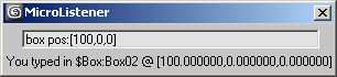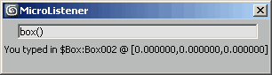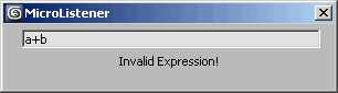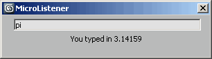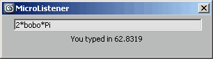 rollout MicroListener "MicroListener" ( edittext myEditText text:"" label theLabel "Ready." on myEditText changed txt do ( if txt != "" then ( try ( val = execute txt theLabel.text = "You typed in "+ (val as string ) ) catch theLabel.text = "Invalid Expression!" ) else theLabel.text = "Ready." ) on myEditText entered txt do myEditText.text = "" ) createDialog MicroListener 300 60