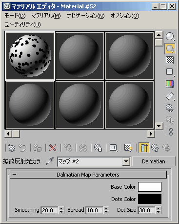 )--end pluginスクリプトを評価します。新しい Dalmatian マップがマテリアル/マップ ブラウザ内に表示されます。このマップは、通常のテクスチャ マップが使用される場所ならどこででも使用できます。既定の外見は、典型的なダルメシアン犬の皮膚に似ています。