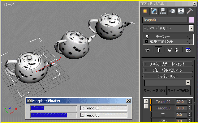 モーファー モディファイヤ付きのオブジェクトが選択されていることを確認します。