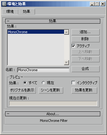 progressCB.setTitle "MonoChrome Effect"setTitle メソッドを progressCB オブジェクトで使用することで、[レンダリング効果](Rendering Effect)進行状況ウィンドウに表示される名前をそれぞれ定義します。[レンダリング プログレス](Renderer Progress)ウィンドウにそれぞれ表示される名前を定義します。前者の例では、「Currently Updating:MonoChrome Effect」という行が表示されます。後者の例では、「Current Task:MonoChrome Effect」という行が表示されます。